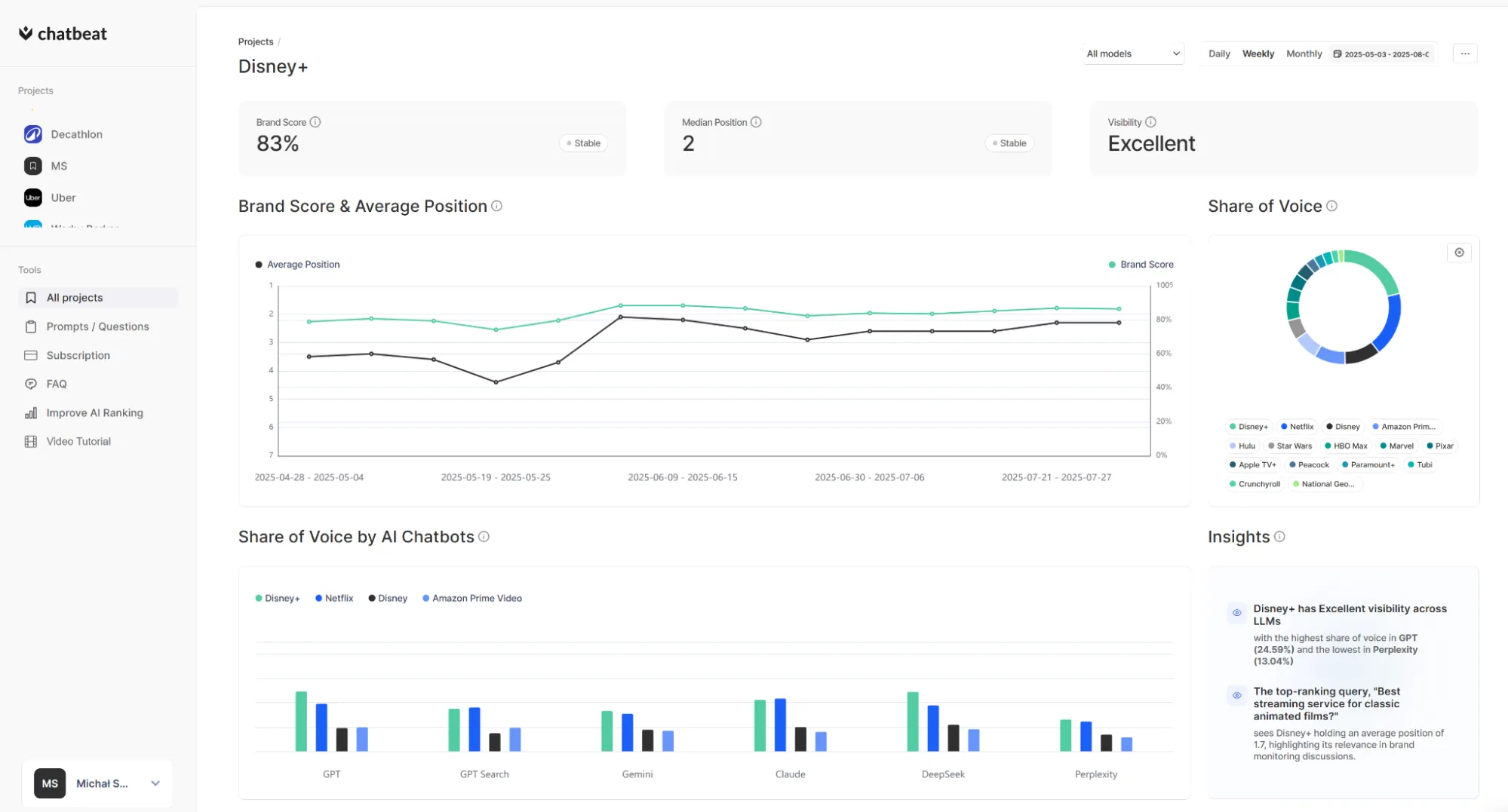 - Chatbeat: Tracks brand visibility inside ChatGPT, Gemini and other LLMs. Focused on measuring brand exposure in AI-generated answers. Strong on Reddit plus news source monitoring. Still evolving its features.