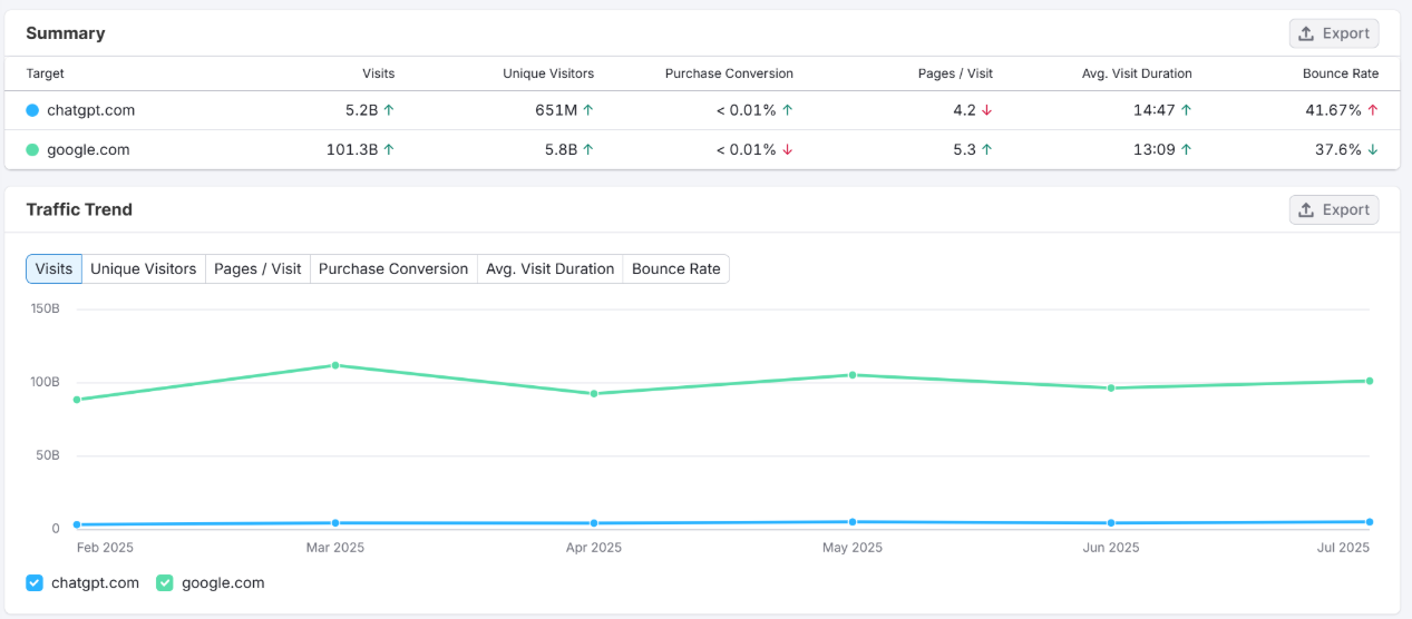 Do you remember ChatGPT becoming the first ever product to reach 100 million users within just three months? Well, according to Semrush (August 2025), ChatGPT is currently visited by 5.3 billion users monthly - 5.3 billion! It is well above 6 percent of Google traffic and growing. Statcounter data (2025) shows that Google’s share of desktop searches declined from 87.65% in May 2023 to an all-time low of 79.1% in March 2025.